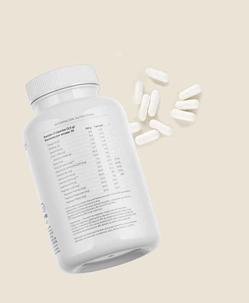 Formulado con Bisglicinato de Magnesio, L-Triptófano, Zinc y Probióticos que favorecen un sueño reparador y contribuyen al equilibrio emocional.